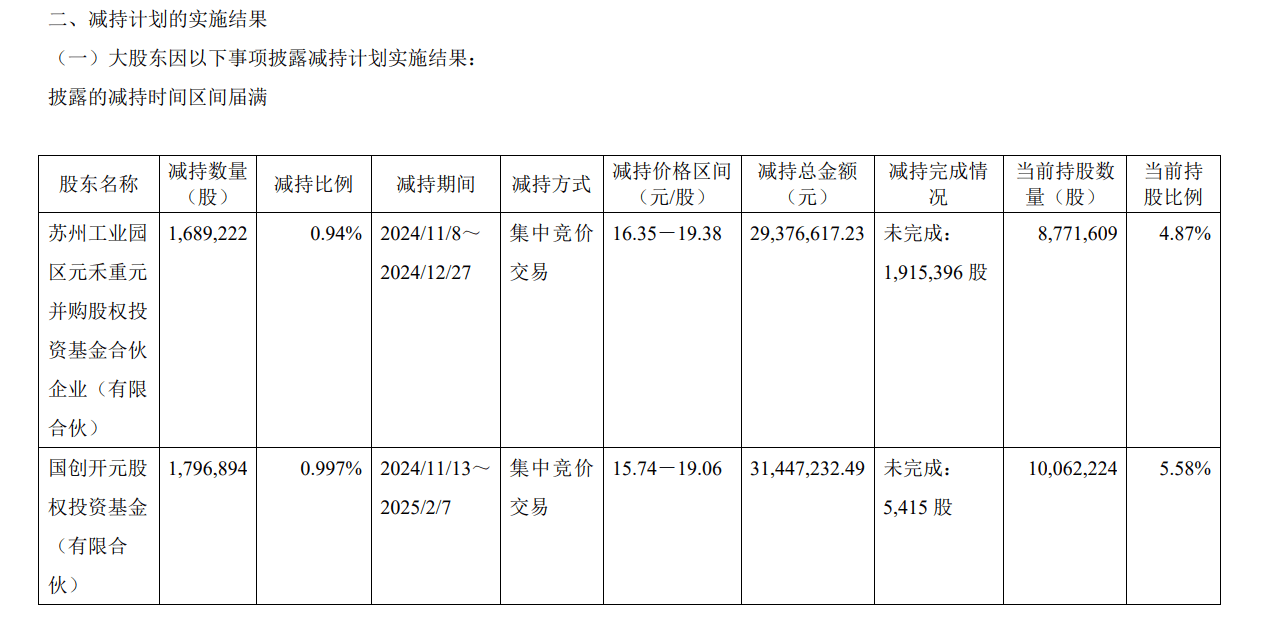 本次减持打算实施前,姑苏工业园区元禾沉元并购股权投资基金合股企业(无限合股)(元禾沉元)持有山石网科通信手艺股份无限公司(山石网科)股份10,460,831股,约占公司总股本的5。80%,为公司IPO前取得股份,并于2022年9月30日起上市畅通。同时,国创开元股权投资基金(无限合股)(国创开元)持有公司股份11,859,118股,约占公司总股本的6。58%,为公司IPO前取得股份,并于2022年9月30日起上市畅通。2024年10月18日,公司披露了《山石网科通信手艺股份无限公司股东减持股份打算通知布告》(通知布告编号:2024-085),因基金到期及本身资金需求,元禾沉元拟通过集中竞价及大买卖体例减持公司股份不跨越3,604,618股,即不跨越公司总股本的2。00%。此中,通过集中竞价体例减持不跨越1,802,309股,即不跨越公司总股本的1。00%,自减持打算通知布告披露之日起15个买卖日后的3个月内进行,且肆意持续90日内减持股份总数不跨越公司总股本的1。00%;通过大买卖体例减持不跨越1,802,309股,即不跨越公司总股本的1。00%,自减持打算通知布告披露之日起15个买卖日后的3个月内进行,且肆意持续90日内减持股份总数不跨越公司总股本的2。00%。同时,国创开元拟通过集中竞价体例减持公司股份不跨越1,802,309股,即不跨越公司总股本的1。00%,自减持打算通知布告披露之日起15个买卖日后的3个月内进行,且肆意持续90日内减持股份总数不跨越公司总股本的1。00%。近日,公司别离收到元禾沉元、国创开元出具的《关于山石网科通信手艺股份无限公司股东减持股份成果的奉告函》,截至2025年2月7日,元禾沉元通过集中竞价买卖体例合计减持公司股份1,689,222股,约占公司总股本的0。94%;国创开元通过集中竞价买卖体例合计减持公司股份1,796,894股,约占公司总股本的0。997%。本次减持打算时间区间已届满,本次减持打算已实施完毕。