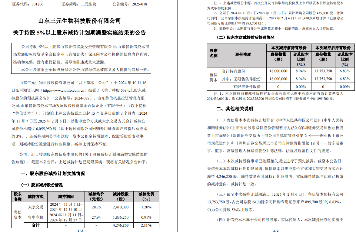 山东三元生物科技股份无限公司(三元生物)于2024年10月16日正在巨潮资讯网披露了《关于持股5%以上股东减持股份的预披露通知布告》(通知布告编号:2024-078)。山东鲁信祺晟投资办理无限公司-鲁信本钱市场成长股权投资基金合股企业(无限合股)(鲁信本钱)打算自上述通知布告披露之日起15个买卖日后的3个月内以集中竞价体例或大买卖体例合计减持公司股份不跨越6,055,950股(即不跨越剔除公司回购公用证券账户股份后总股本的3%)。公司于近日收到股东鲁信本钱出具的《关于股份减持打算期满暨实施成果的奉告函》,截至本通知布告日,上述减持打算已刻日届满。截至本次减持打算期满日(2025年2月6日),鲁信本钱仍持有公司13,753,750股,占公司总股本(扣除公司回购公用证券账户895,700股)的6。83%,仍为公司持股5%以上股东。