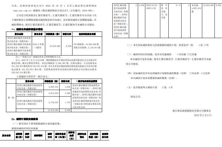 姑苏快可光伏电子股份无限公司(快可电子)股东成都富星羽股权投资基金合股企业(无限合股)(成都富星羽)持有公司股份5,825,700股(占公司总股本比例6。99%),打算以集中竞价买卖和大买卖体例减持公司股份合计不跨越1,666,400股(占本公司总股本比例不跨越2。00%)。以集中竞价买卖体例减持,正在减持打算通知布告之日起15个买卖日后的3个月内实施,减持实施期间为2024年11月1日至2025年1月31日,减持股数不跨越总股本的1。00%,即不跨越833,200股。以大买卖体例减持,正在减持打算通知布告之日起15个买卖日后的3个月内实施,减持实施期间为2024年11月1日至2025年1月31日,减持股数不跨越总股本的1。00%,即不跨越833,200股。公司近日收到股东成都富星羽出具的《股份减持打算实施成果奉告函》,截至2025年1月31日,成都富星羽股份减持打算实施刻日届满。