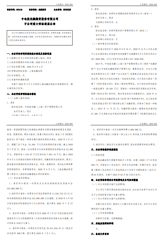 中电投先融期货股份无限公司(先融期货)子公司严沉诉讼进展通知布告。被告:中电投先融(上海)资产办理无限公司,挂牌公司全资子公司。被告:安顺市交通扶植投资无限义务公司(被告一),安顺市国有资产办理无限公司(被告二)。上海金融法院已按照申请施行人申请,根据(2020)沪74平易近初2501号,对被施行人依法施行,经两边告竣息争,并履行完毕,故根据《最高关于施行工做若干问题的(试行)》第64条,本案于2025年02月05日施行完毕。