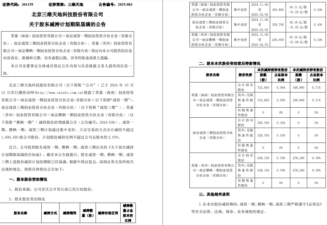 三维六合科技股份无限公司(三维六合)已于2024年10月15日正在巨潮资讯网披露了英豪(海南)创业投资无限公司-南京成贤一期创业投资合股企业(无限合股)(以下简称“成贤一期”)、南京成贤三期创业投资合股企业(无限合股)(以下简称“成贤三期”)、英豪(姑苏)创业投资无限公司-南京雅枫一期创业投资合股企业(无限合股)(以下简称“雅枫一期”)减持股份的预披露通知布告(通知布告编号:2024-030)。成贤一期、雅枫一期、成贤三期打算通过集中竞价、大买卖的体例合计减持不跨越1,600,450股公司股份,打算股份减持比例不跨越公司总股本的2。07%。近日,公司收到股东成贤一期、雅枫一期、成贤三期出具的《关于上次减持打算刻日届满的奉告函》,截至本通知布告披露日,股东成贤一期、雅枫一期、成贤三期上述股份减持打算的刻日曾经届满。