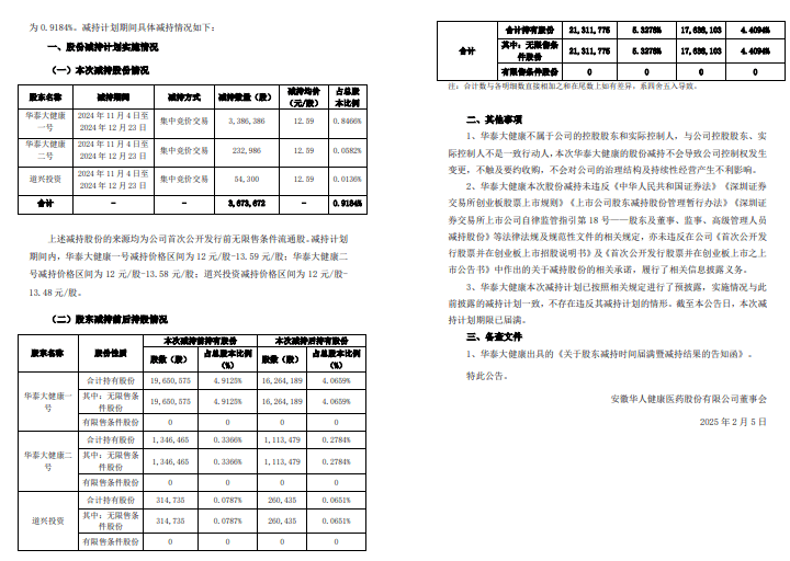 安徽华人健康医药股份无限公司(华人健康)于巨潮资讯网披露了《关于公司持股5%以上股东减持股份的预披露通知布告》(通知布告编号:2024-054),股东华泰紫金投资无限义务公司-南京华泰大健康一号股权投资合股企业(无限合股)(华泰大健康一号)、华泰紫金投资无限义务公司-南京华泰大健康二号股权投资合股企业(无限合股)(华泰大健康二号)及南京道兴创业投资办理核心(通俗合股)(道兴投资,三者以下合称“华泰大健康”)打算自该通知布告披露之日起十五个买卖日后的三个月内,以集中竞价买卖体例减持不跨越4,000,000股,减持比例不跨越总股本1%。公司于巨潮资讯网披露了《关于合计持股5%以上股东权益变更的提醒性通知布告》(通知布告编号:2024-058)及《简式权益变更演讲书》,华泰大健康于2024年7月8日至11月11日期间通过集中竞价买卖减持1,691,207股,此次权益变更后,华泰大健康合计持有公司股份20,000,489股,占总股本400,010,000股的4。999997%。