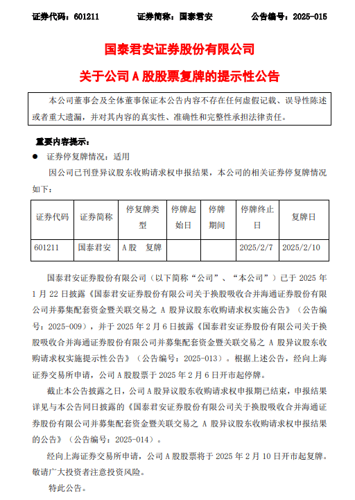 国泰君安证券股份无限公司已于2025年1月22日披露《国泰君安证券股份无限公司关于换股接收归并海通证券股份无限公司并募集配套资金暨联系关系买卖之A股股东收购请求权实施通知布告》(通知布告编号:2025-009),并于2025年2月6日披露《国泰君安证券股份无限公司关于换股接收归并海通证券股份无限公司并募集配套资金暨联系关系买卖之A股股东收购请求权实施提醒性通知布告》(通知布告编号:2025-013)。本次A股股东收购请求权实施的股权登记日为2025年2月5日,申报期间为2025年2月6日9!00-15!00。现将本次A股股东收购请求权申报成果通知布告如下:正在本次收购请求权申报期间内,没有A股股东申报行使收购请求权。