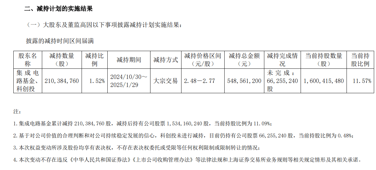 集成电基金和科创投打算通过大买卖体例减持其持有的公司股份数量合计不跨越276,640,000股,合计减持比例不跨越公司总股本的2。00%,减持期间为2024年10月30日至2025年1月29日。正在上述减持期间内,集成电基金和科创投通过大买卖体例累计减持公司股票210,384,760股,占公司股份总额的1。52%。此中,集成电基金减持210,384,760股,减持后持有公司股票1,534,160,240股,当前持股比例为11。09%。基于对公司价值的合理判断和对公司持续不变成长的决心,科创投未进行减持,仍持有公司股票66,255,240股,当前持股比例为0。48%。