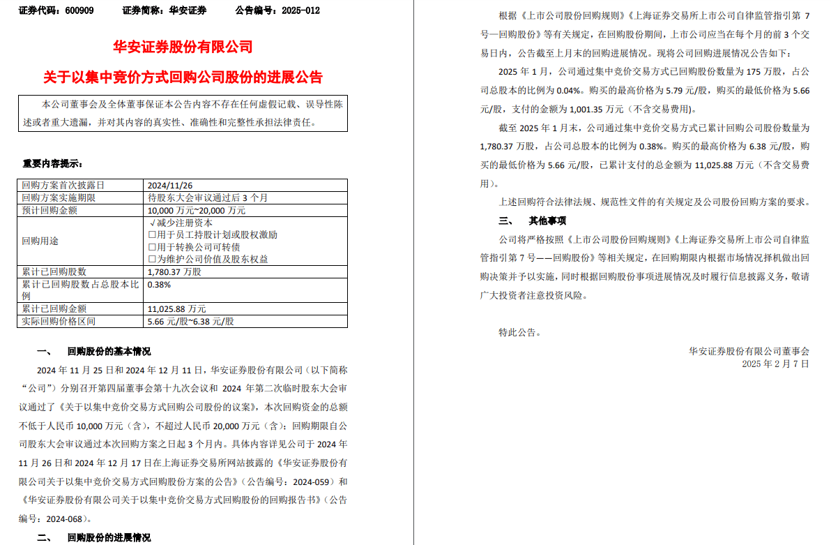 2024年11月25日和2024年12月11日,华安证券别离召开第四届董事会第十九次会议和2024年第二次姑且股东大会审议通过了《关于以集中竞价买卖体例回购公司股份的议案》,本次回购资金的总额不低于人平易近币10,000万元(含),不跨越人平易近币20,000万元(含);回购刻日自公司股东大会审议通过本次回购方案之日起3个月内。2025年1月,公司通过集中竞价买卖体例已回购股份数量为175万股,占公司总股本的比例为0。04%。采办的最高价钱为5。79元/股,采办的最低价钱为5。66元/股,领取的金额为1,001。35万元(不含买卖费用)。截至2025年1月末,公司通过集中竞价买卖体例已累计回购公司股份数量为1,780。37万股,占公司总股本的比例为0。38%。采办的最高价钱为6。38元/股,采办的最低价钱为5。66元/股,已累计领取的总金额为11,025。88万元(不含买卖费用)。
