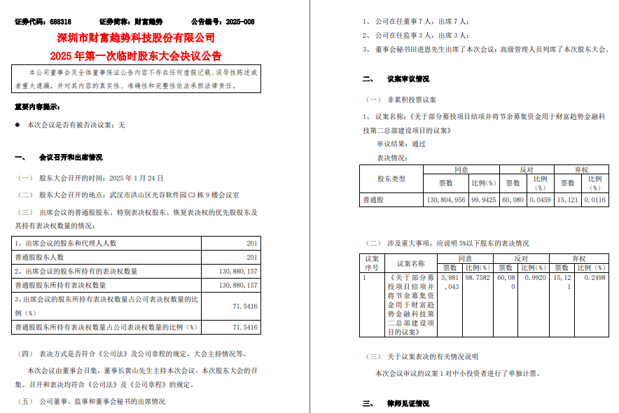 深圳市财富趋向科技股份无限公司(财富趋向)于2025年1月24日召开2025年第一次姑且股东大会,审议通过《关于部门募投项目结项并将结余募集资金用于财富趋向金融科技第二总部扶植项目标议案》。