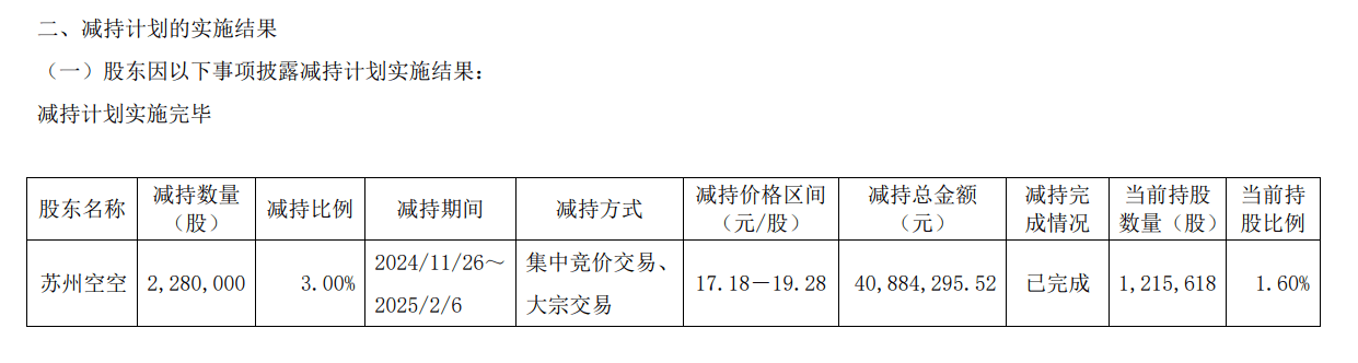 公司于2024年11月5日披露《关于合计持股5%以上股东减持股份打算通知布告》(通知布告编号:2024-065),姑苏空空拟通过竞价买卖、大买卖体例减持富吉瑞股份数量合计不跨越2,280,000股,即不跨越公司总股本的3%。本次通过集中竞价和大买卖体例减持的,自通知布告披露之日起15个买卖日后的3个月内进行。公司于近日收到股东姑苏空空及其分歧步履人姑苏兆戎、上海兆韧发来的《关于富吉瑞光电科技股份无限公司股份减持成果的奉告函》,正在本次减持打算期间,股东姑苏空空通过集中竞价买卖、大买卖体例合计减持公司股份数量2,280,000股,占公司总股本的3。00%,本次减持打算已实施完毕。
