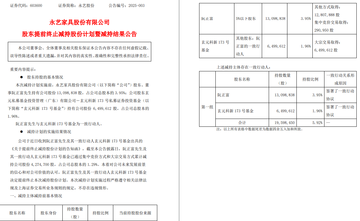 永艺股份于近日收到阮正富先生及其分歧步履人玄元科新173号基金出具的《关于提前终止减持股份打算的奉告函》,截至本通知布告披露日,阮正富先生及其分歧步履人玄元科新173号基金已通过集中竞价体例和大买卖体例累计减持公司股份4,274,700股,占公司总股本的1。29%。本着对公司将来成长前景的决心和对公司价值的承认,阮正富先生及其分歧步履人玄元科新173号基金决定提前终止本次减持股份打算。