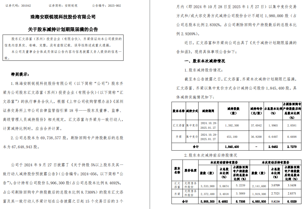 珠海安联锐视科技股份无限公司(安联锐视)股东齐梁为公司股东汇文添富(姑苏)投资企业(无限合股)(汇文添富)的施行事务合股人。公司总股本为69,738,577股,剔除回购专户持股数后的总股本为67,648,943股。公司于2024年9月27日披露了《关于持股5%以上股东及其分歧步履人减持股份预披露通知布告》(通知布告编号:2024-056),合计持有公司股份5,906,300股(占公司总股本比例8。4692%,占公司剔除回购专户持股数后的总股本比例8。7308%)的股东汇文添富及其分歧步履人齐梁打算正在通知布告披露之日起15个买卖日后的3个月内(即2024年10月28日至2025年1月27日)以集中竞价买卖体例和/或大买卖体例减持公司股份合计不跨越1,980,000股(占公司总股本比例2。8392%,占公司剔除回购专户持股数后的总股本比例2。9269%)。近日,汇文添富和齐梁向公司出具了《关于减持打算刻日届满的奉告函》。截至本通知布告披露之日,汇文添富、齐梁本次减持打算刻日已届满,汇文添富、齐梁以集中竞价体例合计减持公司股份1,845,400股。