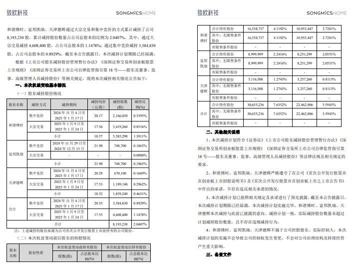 近日,公司收到股东协调博时、富邦凯瑞、天津德辉出具的《关于减持致欧科技股份减持打算期满的奉告函》。2024年10月30日至2025年1月29日期间,协调博时、富邦凯瑞、天津德辉通过大买卖和集中竞价的体例累计减持致欧科技8,193,230股,累计减持比例为2。0407%。此中,大买卖减持4,608,400股,占总股本的1。1478%;集中竞价减持3,584,830股,占总股本的0。8929%。截至本通知布告披露日,本次减持打算刻日曾经届满。