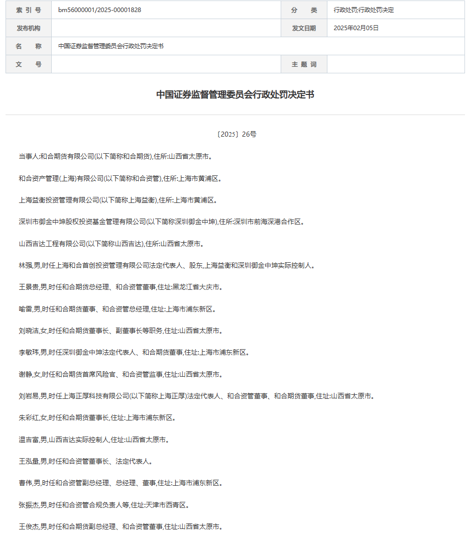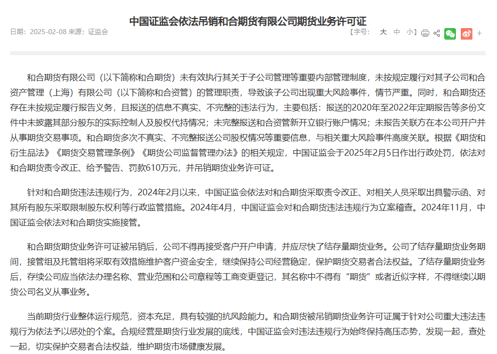 答:和合期货未无效施行其关于子公司办理等主要内部办理轨制,未按履行对其子公司和合伙产办理(上海)无限公司(以下简称和合伙管)的办理职责,导致该子公司呈现严沉风险事务,情节严沉。同时,和合期货还存正在未按履行演讲权利,且报送的消息不实正在、不完整的违法行为,次要包罗:报送的2020年至2022年按期演讲等多份文件中未披露其部门股东的现实节制人及股权代持环境;未完整报送和合伙管新开立银行账户环境;未演讲联系关系朴直在本公司开户并处置期货买卖事项。和合期货多次不实正在、不完整报送公司股权环境等主要消息,取相关严沉风险事务高度联系关系。按照《期货和衍生品法》《期货买卖办理条例》《期货公司监视办理法子》的相关,中国证监会于2025年2月5日做出行政惩罚,依法对和合期货责令更正、赐与、罚款610万元,并吊销期货营业许可证。