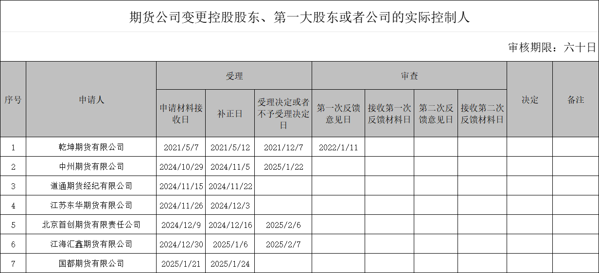 道通期货经纪无限公司控股股东变动申请,2024年11月15日材料领受,2024年11月22日补正。江苏东华期货无限公司控股股东变动申请,2024年11月26日材料领受,2024年12月23日补正。