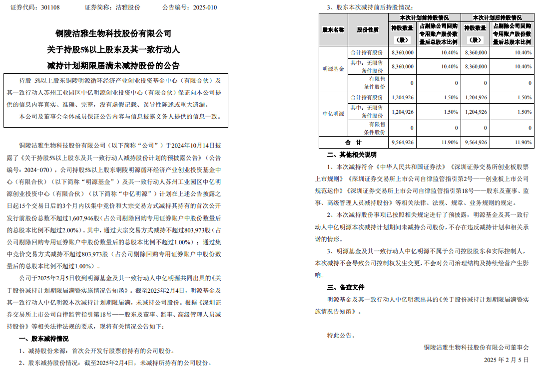 铜陵洁雅生物科技股份无限公司(洁雅股份)于2024年10月14日披露《关于持股5%以上股东及其分歧步履人减持股份打算的预披露通知布告》(通知布告编号:2024-070),公司持股5%以上股东铜陵明源轮回经济财产创业投资基金核心(无限合股)(明源基金)及其分歧步履人姑苏工业园区中亿明源创业投资核心(无限合股)(中亿明源)打算正在上述通知布告披露之日起15个买卖日后的3个月内以集中竞价和大买卖体例减持其持有的初次公开辟行前股份总数不跨越1,607,946股(占公司剔除回购公用证券账户中股份数量后的总股本比例不跨越2。00%)。此中大买卖减持不跨越803,973股(占公司剔除回购公用证券账户中股份数量后的总股本比例不跨越1。00%);集中竞价减持不跨越803,973股(占公司剔除回购公用证券账户中股份数量后的总股本比例不跨越1。00%)。