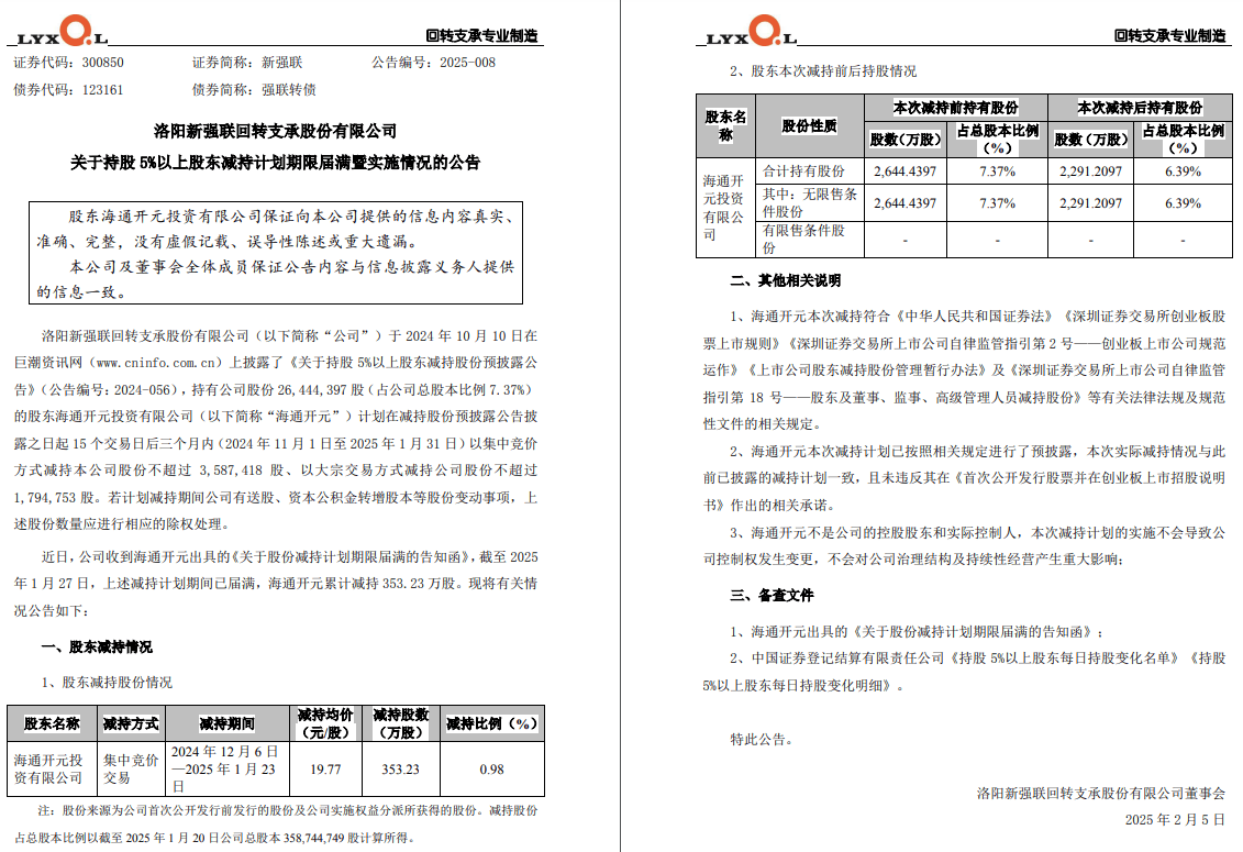 洛阳新强联反转展转支承股份无限公司(新强联)于2024年10月10日正在巨潮资讯网上披露了《关于持股5%以上股东减持股份预披露通知布告》(通知布告编号:2024-056),持有公司股份26,444,397股(占公司总股本比例7。37%)的股东海通开元投资无限公司(海通开元)打算正在减持股份预披露通知布告披露之日起15个买卖日后三个月内(2024年11月1日至2025年1月31日)以集中竞价体例减持不跨越3,587,418股、以大买卖体例减持不跨越1,794,753股。近日,公司收到海通开元出具的《关于股份减持打算刻日届满的奉告函》,截至2025年1月27日,上述减持打算期间已届满,海通开元累计减持353。23万股。持股比例由7。37%降至6。39%。