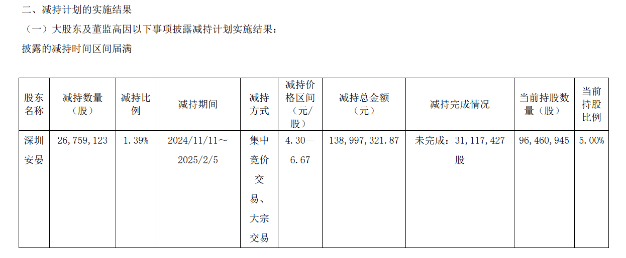 减持打算实施前,深圳安晏投资合股企业(无限合股)(以下简称“深圳安晏”)持有五矿新能源材料(湖南)股份无限公司(五矿新能)股份123,220,068股,占公司总股本的6。39%。前述股份来历于公司初次公开辟行股票并上市前取得的股份,已于2022年8月11日解除限售并上市畅通。因本身资金需求,股东深圳安晏打算自通知布告披露之日起15个买卖日后的三个月内(2024年11月6日至2025年2月5日)以集中竞价买卖、大买卖体例减持其所持有的公司股份数量合计不跨越57,876,550股,减持比例不跨越公司总股本的3%。公司于近日收到股东深圳安晏出具的《股份减持成果奉告函》,截至2025年2月5日收盘,深圳安晏通过集中竞价和大买卖体例累计减持了公司股份26,759,123股,占公司总股本1。39%。本次减持打算披露的减持时间区间届满。