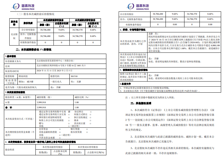 固高科技股份无限公司(固高科技)于2025年2月5日收到股东股权投资成长办理核心(无限合股)(以下简称“股权”)出具的《关于股东股份减持打算实施完成暨权益变更达到1%的奉告函》,获悉股权于2024年11月11日至2025年2月5日通过集中竞价体例减持3,999,910股,权益变更比例为1。00%。股权本次股份减持打算已完成。
