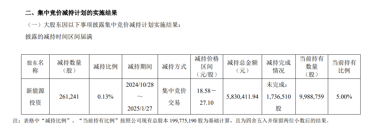2024年9月28日,公司正在上海证券买卖所网坐披露了《持股5%以上股东减持股份打算通知布告》(通知布告编号:2024-035)。新能源投资打算以集中竞价体例减持公司股份不跨越1,997,751股,即不跨越公司总股本的1%,将于上述减持打算通知布告披露之日起15个买卖日后的3个月内实施。