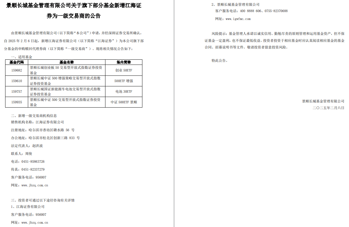 由景顺长城基金办理无限公司申请,并经深圳证券买卖所确认,自2025年2月6日起,新增江海证券无限公司为本公司旗下部门基金的申购赎回代办署理券商(一级买卖商)。