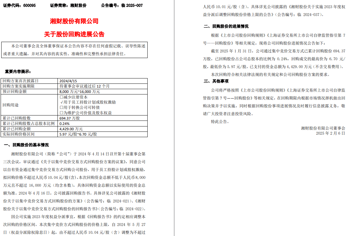 湘财股份无限公司(湘财股份)于2024年4月14日召开第十届董事会第三次会议,审议通过《关于以集中竞价买卖体例回购股份方案的议案》,同意公司以自有资金通过集中竞价买卖体例回购公司股份,用于员工持股打算或股权激励,拟回购价钱不跨越人平易近币10。04元/股(含),回购资金总额不低于人平易近币8,000万元且不跨越16,000万元(均含本数),具体回购资金总额以现实利用的资金总额为准。2024年4月16日,公司披露回购演讲书。因公司实施2023年度权益事宜,按照《回购演讲书》的商定响应调整本次回购的价钱区间。本次集中竞价体例回购股份的价钱上限,自2024年5月27日(权益除权除息日)起,由不跨越人平易近币10。04元/股(含)调整为不跨越人平易近币10。01元/股(含)。截至2025年1月31日,湘财股份通过集中竞价买卖体例已累计回购股份694。37万股,已回购股份占公司总股本的比例为0。24%,回购成交的最高价为6。70元/股,最低价为5。97元/股,已领取的资金总额为4,429。00万元(不含买卖费用)。