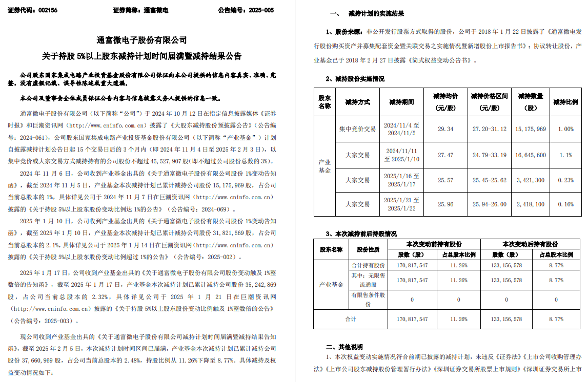 通富微电子股份无限公司(通富微电)股东国度集成电财产投资基金股份无限公司(以下简称“财产基金”)打算自披露减持打算通知布告日起15个买卖日后的3个月内(即2024年11月4日至2025年2月3日),以集中竞价或大买卖体例减持持有的公司股份不跨越45,527,907股(即不跨越公司股份总数的3%)。现公司收到财产基金出具的《关于通富微电减持打算时间届满暨减持成果奉告函》,截至2025年2月5日,本次减持打算时间区间已届满,财产基金本次减持打算已累计减持公司股份37,660,969股,占公司当前总股本的2。48%,持股比例从11。26%下降至8。77%。