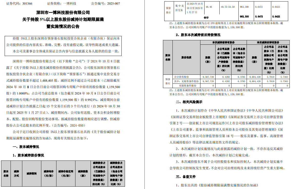深圳市一博科技股份无限公司(一博科技)于2024年10月8日披露了《关于持股5%以上股东减持股份的预披露通知布告》,公司股东深圳市领誉基石股权投资合股企业(无限合股)(领誉基石)拟通过集中竞价买卖体例减持股份数量不跨越1,488,405股,减持比例不跨越公司总股本(已剔除截至2024年10月8日通知布告日前公司股票回购公用账户中持有的股份数量1,159,500股)的1。0000%,占公司当前总股本(包含截至2024年10月8日通知布告日前公司股票回购公用账户中持有的股份数量1,159,500股)的0。9923%。减持期间自前述减持打算通知布告披露之日起15个买卖日后的3个月内进行(自2024年10月30日起至2025年1月27日止)。