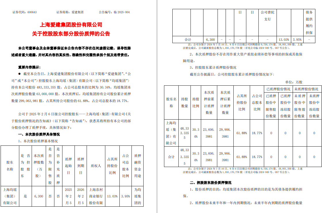 上海爱建集团股份无限公司(爱建集团)控股股东上海均瑶(集团)无限公司(均瑶集团)持有本公司股份483,333,355股,占公司总股本的比例为30。34%。均瑶集团本次质押股份数量63,000,000股(占总股本的3。95%);本次质押后,均瑶集团持有公司股份累计质押数量299,063,981股,占其所持公司股份的61。88%,占公司总股本的18。77%。公司于2025年2月6日接公司控股股东均瑶集团《关于股份质押环境的奉告函》。质押起始日:2025年2月5日,质押到期日:2026年2月5日;质权人上海农村贸易银行股份无限公司普陀支行,质押融资资金用处为均瑶集团的债权供给履约。
