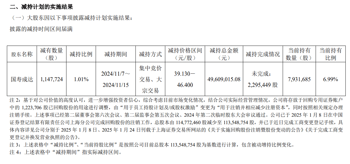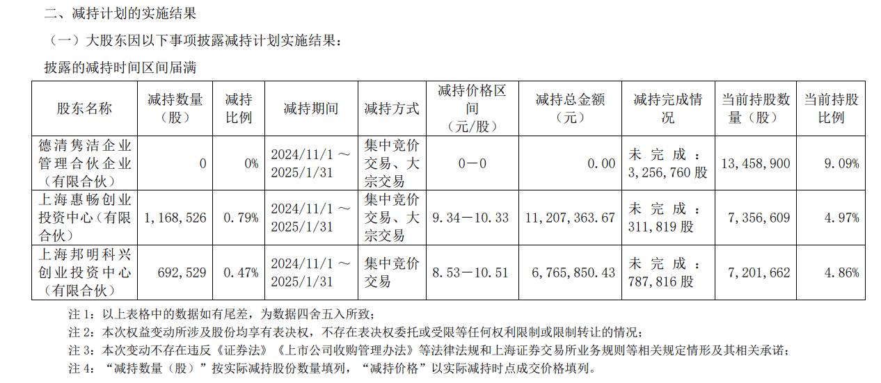 近日,公司收到股东隽洁投资出具的《关于减持股份打算时间届满未减持股份的奉告函》取股东惠畅创投、股东邦明创投别离出具的《关于减持股份打算时间届满暨减持股份成果的奉告函》,截至本通知布告披露日,本次减持打算时间区间届满,上述股东减持成果具体如下:1、股东隽洁投资于2024年11月1日-2025年1月31日期间,未通过集中竞价买卖或大买卖体例减持其所持有的公司股份;2、股东惠畅创投于2024年11月1日-2025年1月31日期间,合计减持公司股份1,168,526股,减持比例为0。79%;此中通过集中竞价买卖体例累计减持68,526股,占公司总股本0。05%;通过大买卖体例累计减持1,100,000股,占公司总股本0。74%。本次减持后,股东惠畅创投持有公司股份7,356,609股,占公司总股本的4。97%,不再是公司持股5%以上的股东;3、股东邦明创投于2024年11月1日-2025年1月31日期间,通过集中竞价买卖体例合计减持公司股份692,529股,减持比例为0。47%。本次减持后,股东邦明创投持有公司股份7,201,662股,占公司总股本的4。86%,不再是公司持股5%以上的股东。