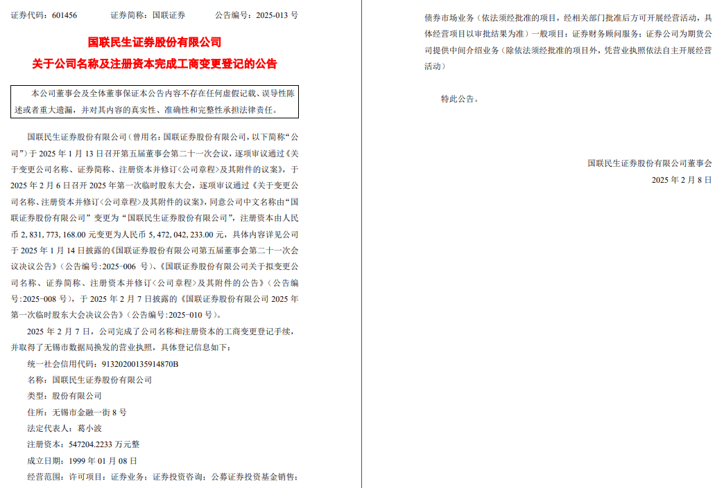 国联平易近生证券股份无限公司(曾用名:国联证券股份无限公司)于2025年1月13日召开第五届董事会第二十一次会议,逐项审议通过《关于变动公司名称、证券简称、注册本钱并修订公司章程及其附件的议案》,于2025年2月6日召开2025年第一次姑且股东大会,逐项审议通过《关于变动公司名称、注册本钱并修订公司章程及其附件的议案》,同意公司中文名称由“国联证券股份无限公司”变动为“国联平易近生证券股份无限公司”,注册本钱由人平易近币2,831,773,168。00元变动为人平易近币5,472,042,233。00元。2025年2月7日,公司完成了公司名称和注册本钱的工商变动登记手续,并取得了无锡市数据局换发的停业执照。