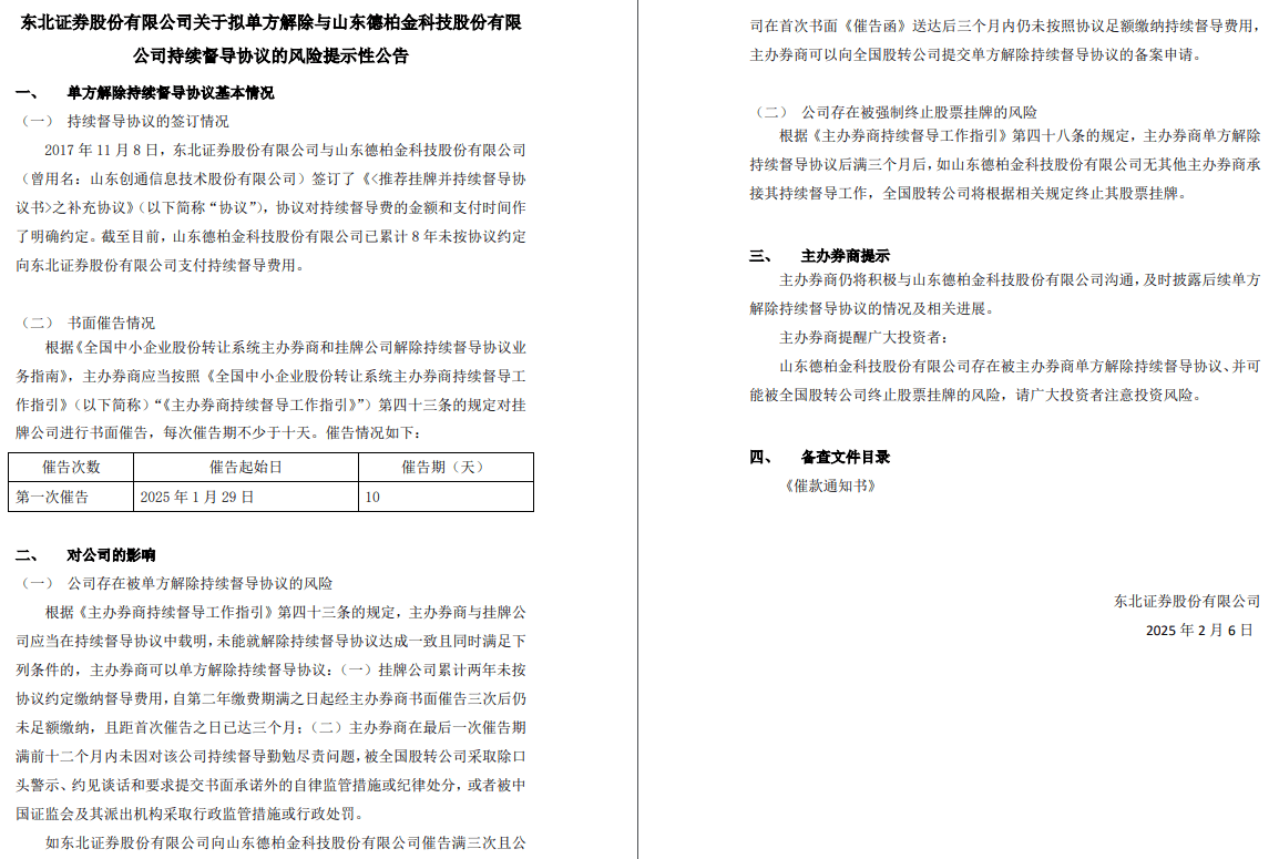 2017年11月8日,东北证券股份无限公司取山东德柏金科技股份无限公司(曾用名:山东创通消息手艺股份无限公司)签定了《保举挂牌并持续督导和谈书之弥补和谈》,和谈对持续督导费的金额和领取时间做了明白商定。截至目前,山东德柏金科技股份无限公司(德柏金)已累计8年未按和谈商定向东北证券领取持续督导费用。