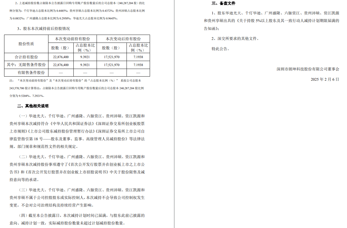 深圳市朗坤科技股份无限公司(朗坤)于2024年10月11日披露了《关于合计持股5%以上股东及其分歧步履人减持股份预披露通知布告》(通知布告编号:2024-081)。公司合计持股5%以上股东及其分歧步履人深圳华迪光大股权投资基金(无限合股)(华迪光大)、广东千灯华迪股权投资企业(无限合股)(千灯华迪)、广州盛隆投资合股企业(无限合股)(广州盛隆)、广州六脉资江股权投资合股企业(无限合股)(六脉资江)、贵州沛硕股权投资合股企业(无限合股)(贵州沛硕)、广州资江凯源股权投资合股企业(无限合股)(资江凯源)和贵州享硕股权投资合股企业(无限合股)(贵州享硕)打算自上述通知布告披露之日起15个买卖日后的3个月内(即2024年11月4日至2025年2月3日)通过集中竞价或大买卖的体例减持公司股份7,220,004股,占公司总股本的比例不跨越2。96%,占剔除回购股份后的公司总股本比例不跨越3%。