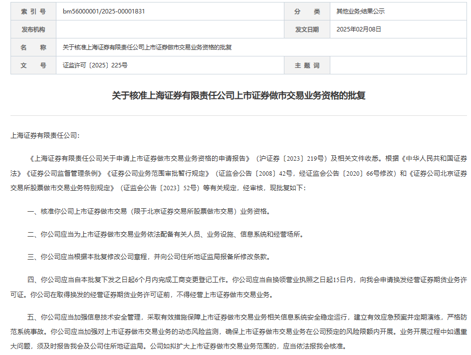 关于核准上海证券无限义务公司上市证券做市买卖营业资历的批复(证监许可〔2025〕225号)。
