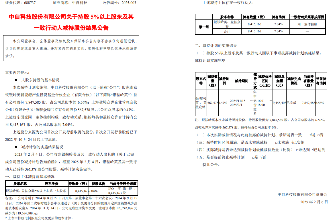 本次减持打算实施前,中自科技股份无限公司(中自科技)股东南京银鞍岭英新能源财产投资基金合股企业(无限合股)(银鞍岭英)持有公司股份7,847,585股,占总股本的6。56%;上海盈鞍众骅企业办理合股企业(无限合股)(盈鞍众骅)持有公司股份567,578股,占总股本的0。47%;上述股东因受统一从体节制形成分歧步履关系,银鞍岭英和盈鞍众骅合计持有公司8,415,163股,占总股本的7。04%。上述股份来历为公司初次公开辟行前取得的股份,初次公开辟行前股份已于2022年10月24日起上市畅通。