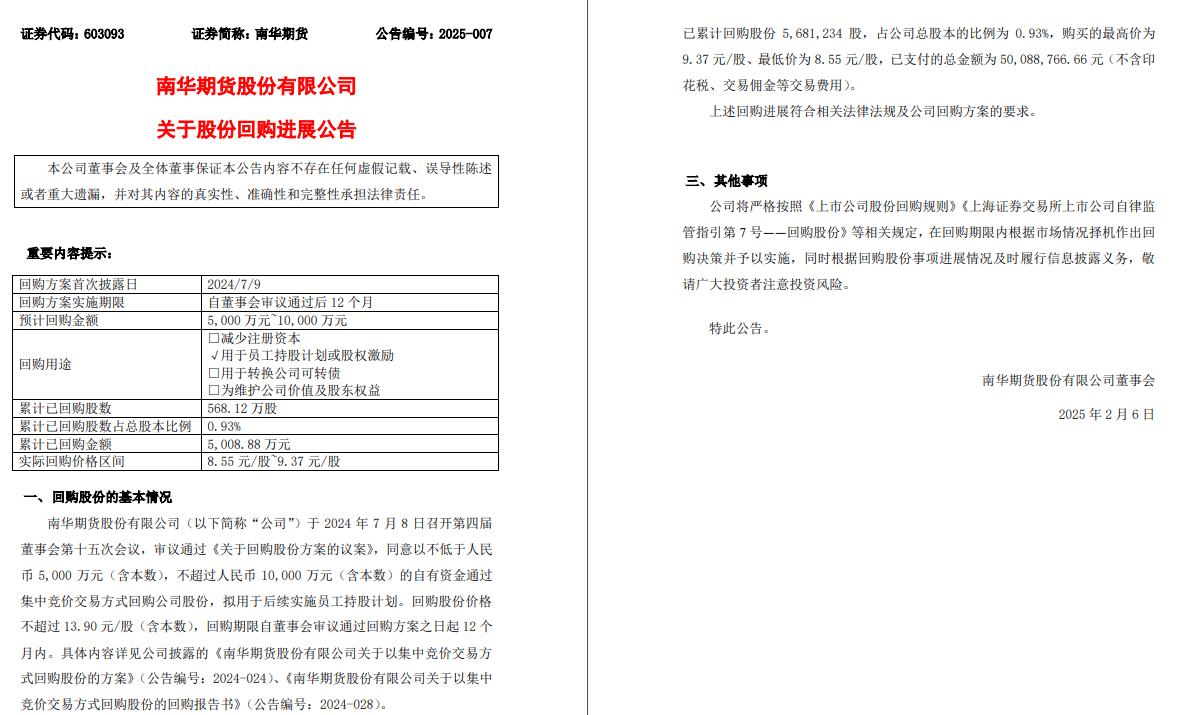 南华期货股份无限公司(南华期货)于2024年7月8日召开第四届董事会第十五次会议,审议通过《关于回购股份方案的议案》,同意以不低于人平易近币5,000万元(含本数),不跨越人平易近币10,000万元(含本数)的自有资金通过集中竞价买卖体例回购公司股份,拟用于后续实施员工持股打算。回购股份价钱不跨越13。90元/股(含本数),回购刻日自董事会审议通过回购方案之日起12个月内。截至2025年1月31日,公司通过上海证券买卖所系统以集中竞价买卖体例已累计回购股份5,681,234股,占总股本的比例为0。93%,采办的最高价为9。37元/股、最低价为8。55元/股,已领取的总金额为50,088,766。66元(不含印花税、买卖佣金等买卖费用)。