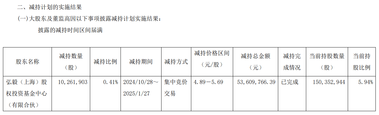 本次减持打算实施前,上海城投控股股份无限公司(城投控股)5%以上股东弘毅(上海)股权投资基金核心(无限合股)持有公司股份共计160,614,847股,占公司总股本的6。35%,上述股份全数由和谈让渡取得。公司于2025年1月27日收盘后收到公司股东弘毅(上海)股权投资基金核心(无限合股)发来的《减持公司股份进展奉告函》,弘毅(上海)股权投资基金核心(无限合股)通过集中竞价买卖体例减持公司股份10,261,903股,占公司总股本的比例0。41%。截至本通知布告披露日,本次减持打算披露的减持时间区间届满,减持打算竣事,弘毅(上海)股权投资基金核心(无限合股)持有公司股份共计150,352,944股,占公司总股本的5。94%。