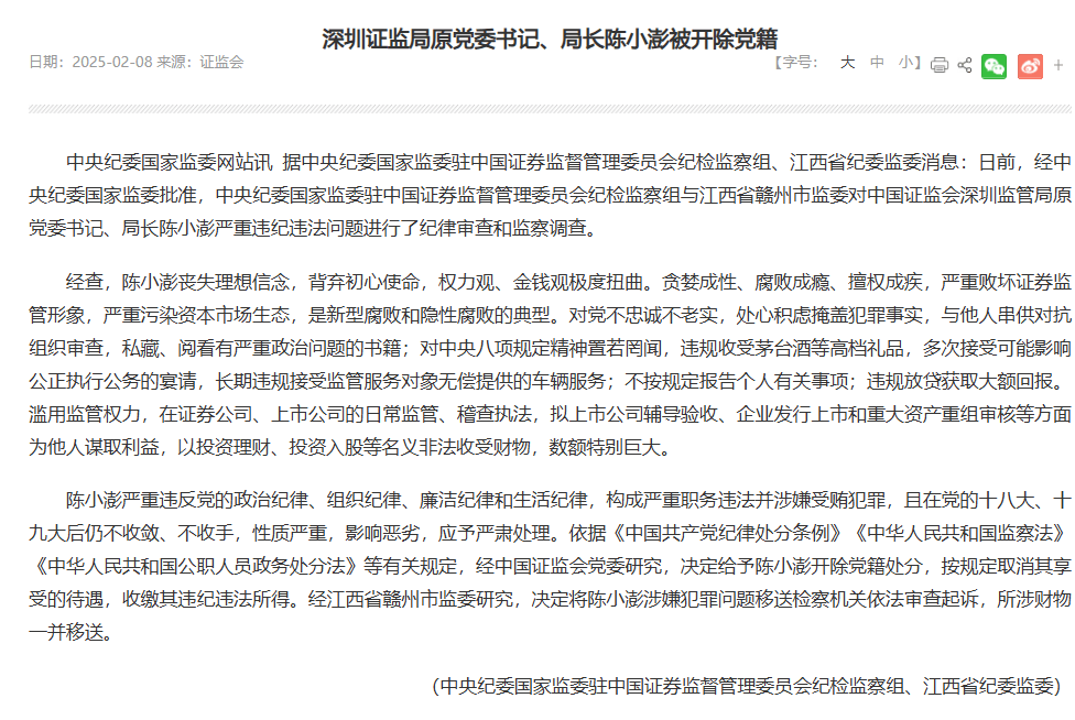 陈小澎严沉违的规律、组织规律、清廉规律和糊口规律,形成严沉职务违法并涉嫌受贿犯罪,且正在党的、十九大后仍不、不收手,性质严沉,影响恶劣,应予庄重处置。根据《中国规律处分条例》《中华人平易近国监察法》《中华人平易近国人员政务处分法》等相关,经中国证监会党委研究,决定赐与陈小澎处分,按打消其享受的待遇,收缴其违纪违法所得。经江西省赣州市监委研究,决定将陈小澎涉嫌犯罪问题移送查察机关依法审查告状,所涉财物一并移送。