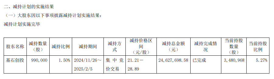 2024年11月5日,公司披露了《光格科技股东减持股份打算通知布告》(通知布告编号:2024-030),股东基石创投拟于2024年11月26日至2025年2月25日期间,通过集中竞价买卖体例和大买卖体例减持公司股份,减持股份数量不跨越990,000股,不跨越公司股份总数的1。50%。减持价钱按照市场价钱确定,价钱不低于公司上市前基石创投的初始入股价钱(期间若有派息、送股、本钱公积金转增股本等除权、除息事项的,上述价钱响应调整)。2024年12月14日,公司披露了《光格科技关于5%以上股东权益变更达到1%的提醒性通知布告》(通知布告编号:2024-038),股东基石创投于2024年11月26日至2024年12月13日通过集中竞价买卖体例减持公司股份数量665,683股,占公司总股本的1。0086%。2025年2月5日,公司收到股东基石创投发来的《关于股东减持股份成果的奉告函》,正在本次减持打算期间,股东基石创投通过集中竞价买卖体例合计2减持公司股份数量990,000股,占公司总股本的1。50%。本次减持打算已实施完毕。