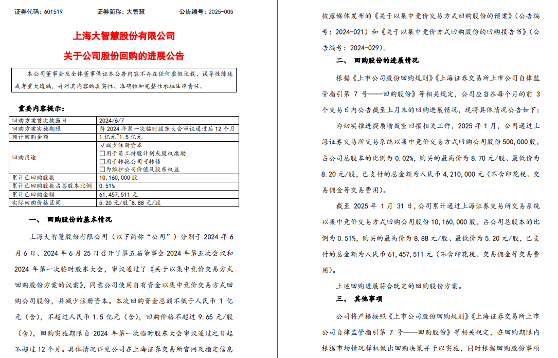上海大聪慧股份无限公司(大聪慧)别离于2024年6月6日、2024年6月25日召开第五届董事会2024年第五次会议和2024年第一次姑且股东大会,审议通过了《关于以集中竞价买卖体例回购股份方案的议案》,同意公司利用自有资金以集中竞价买卖体例回购公司股份,并削减注册本钱。回购资金总额不低于人平易近币1亿元(含),不跨越人平易近币1。5亿元(含),回购价钱不跨越9。65元/股(含),回购实施刻日自2024年第一次姑且股东大会审议通过之日起不跨越12个月。