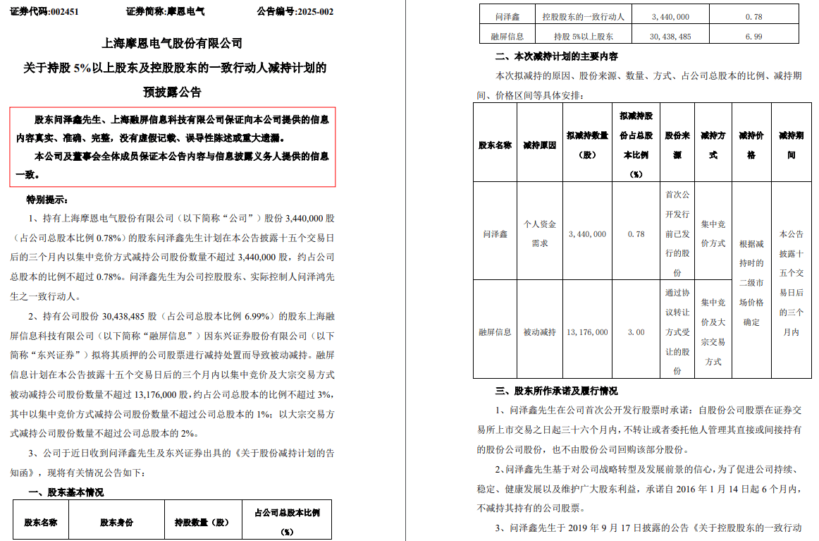 持有上海摩恩电气股份无限公司(摩恩电气)股份3,440,000股(占公司总股本比例0。78%)的股东问泽鑫先生打算正在本通知布告披露十五个买卖日后的三个月内以集中竞价体例减持公司股份数量不跨越3,440,000股,约占公司总股本的比例不跨越0。78%。问泽鑫先生为公司控股股东、现实节制人问泽鸿先生之分歧步履人。持有公司股份30,438,485股(占公司总股本比例6。99%)的股东上海融屏消息科技无限公司(融屏消息)因东兴证券股份无限公司(东兴证券)拟将其质押的公司股票进行减持措置而导致被动减持。融屏消息打算正在本通知布告披露十五个买卖日后的三个月内以集中竞价及大买卖体例被动减持公司股份数量不跨越13,176,000股,约占公司总股本的比例不跨越3%,此中以集中竞价体例减持公司股份数量不跨越公司总股本的1%;以大买卖体例减持公司股份数量不跨越公司总股本的2%。公司于近日收到问泽鑫先生及东兴证券出具的《关于股份减持打算的奉告函》。本次减持股东问泽鑫先生为公司控股股东、现实节制人之分歧步履人。截至本通知布告日,公司控股股东、现实节制人问泽鸿先生持有公司股份167,896,000股,占公司总股本的38。23%;问泽鸿先生及问泽鑫先生合计持有公司股份171,336,000股,占公司总股本的39。01%。本次股份减持打算按最大限度实施后,问泽鑫先生将不再持有公司股份;问泽鸿先生仍为公司控股股东,公司现实节制人未发生变化。