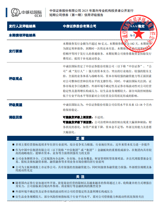 中诚信国际必定了中信证券强大的本钱实力、凸起的行业地位、较强的股东支撑、全面的营业系统取计谋结构、本钱市场较强的融资能力等反面要素对公司全体运营和信用程度的支持感化;同时,中诚信国际关心到,证券市场所作日趋激烈、外部不确定性及证券市场波动性对公司运营不变性及盈利增加形成压力、衍生品营业规模较大、部门风险节制目标低于行业平均程度等要素对公司运营及信用情况构成的影响。