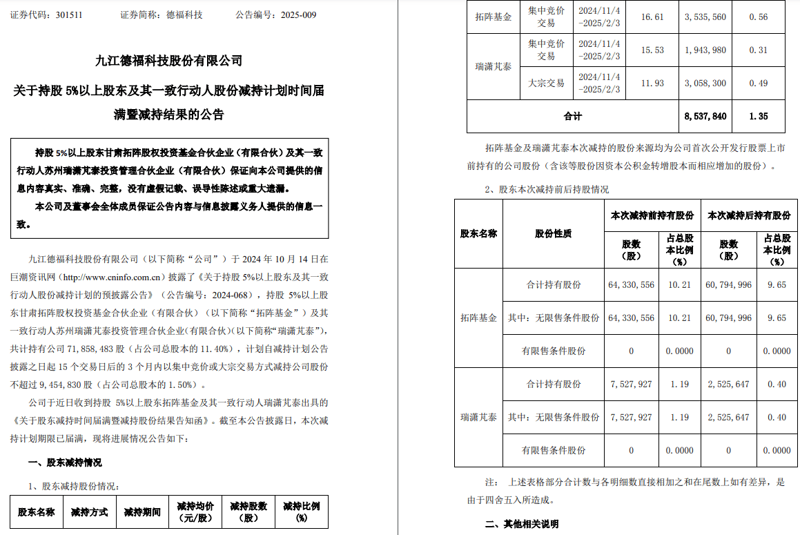 德福科技股份无限公司(德福科技)于2024年10月14日正在巨潮资讯网披露了《关于持股5%以上股东及其分歧步履人股份减持打算的预披露通知布告》(通知布告编号:2024-068),持股5%以上股!