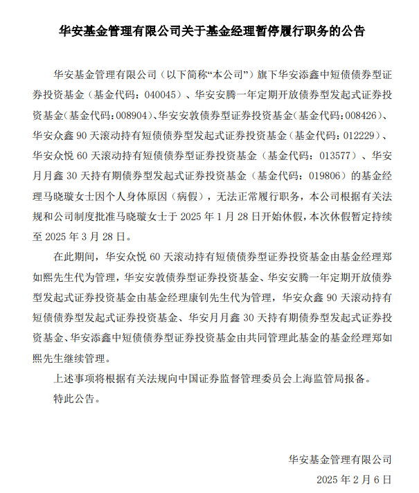 华安基金办理无限公司旗下华安添鑫中短债债券型证券投资基金(基金代码:040045)、华安安腾一年按期债券型倡议式证券投资基金(基金代码:008904)、华安安敦债券型证券投资基金(基金代码:008426)、华安众鑫90天滚动持有短债债券型倡议式证券投资基金(基金代码:012229)、华安众悦60天滚动持有短债债券型证券投资基金(基金代码:013577)、华安月月鑫30天持有期债券型倡议式证券投资基金(基金代码:019806)的基金司理马晓璇密斯因小我身体缘由(病假),无法一般履行职务,本公司按照相关律例和公司轨制核准马晓璇密斯于2025年1月28日起头休假,本次休假暂定持续至2025年3月28日。正在此期间,华安众悦60天滚动持有短债债券型证券投资基金由基金司理郑如熙先生代为办理,华安安敦债券型证券投资基金、华安安腾一年按期债券型倡议式证券投资基金由基金司理康钊先生代为办理,华安众鑫90天滚动持有短债债券型倡议式证券投资基金、华安月月鑫30天持有期债券型倡议式证券投资基金、华安添鑫中短债债券型证券投资基金由配合办理此基金的基金司理郑如熙先生继续办理。上述事项将按照相关律例向中国证券监视办理委员会上海监管局报备。