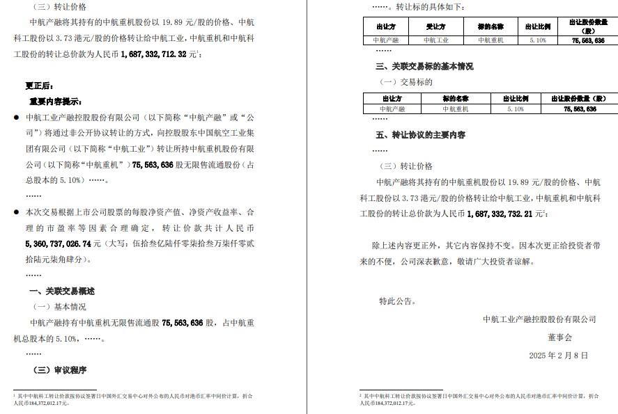 中航工业产融控股股份无限公司(中航产融”)于2025年1月17日披露了《中航工业产融控股股份无限公司关于公司及子公司拟和谈让渡股票暨联系关系买卖的通知布告》(通知布告编号:临2025-003)。颠末后审查,原通知布告中披露的公司所持有的中航沉机股份数,对计数法则理解误差导致存正在1股的尾数差别,现将上述通知布告中的部门内容更正如下!