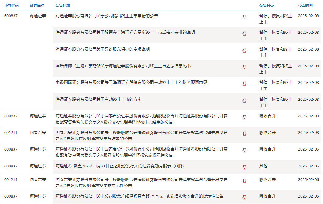 国泰君安证券股份无限公司拟通过向海通证券股份无限公司的全体A股换股股东刊行A股股票、向海通证券的全体H股换股股东刊行H股股票的体例换股接收归并海通证券并刊行A股股票募集配套资金相关事项曾经公司于2024年12月13日召开的2024年第二次姑且股东大会、2024年第一次A股类别股东会及2024年第一次H股类别股东会审议通过,并已获得中国证券监视办理委员会出具的《关于同意国泰君安证券股份无限公司接收归并海通证券股份无限公司并募集配套资金注册、核准国泰君安证券股份无限公司接收归并海通证券股份无限公司、海富通基金办理无限公司变动头要股东及现实节制人、富国基金办理无限公司变动头要股东、海通期货股份无限公司变动头要股东及现实节制人的批复》(证监许可〔2025〕96号)。按照《上海证券买卖所股票上市法则》第9。7。1条第一款第(六)项及其他相关营业法则的,公司已于2025年2月7日向上海证券买卖所提交公司A股股票自动终止上市的申请。公司将正在上海证券买卖所受理公司A股股票自动终止上市申请后登载相关通知布告,并正在上海证券买卖所核准公司A股股票自动终止上市申请后登载相关终止上市通知布告。