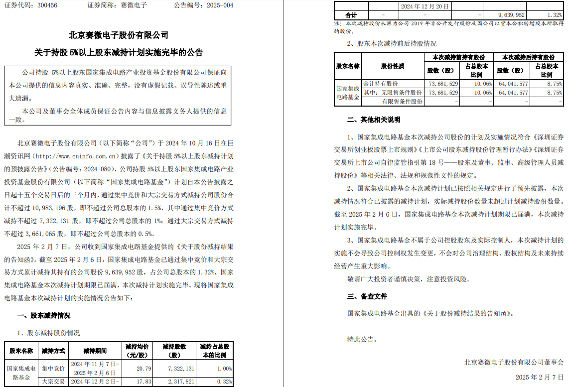 赛微电子股份无限公司(赛微电子)于2024年10月16日正在巨潮资讯网披露了《关于持股5%以上股东减持打算的预披露通知布告》(通知布告编号:2024-080),公司持股5%以上股东国度集成电财产投资基金股份无限公司(以下简称“国度集成电基金”)打算自本通知布告披露之日起十五个买卖日后的三个月内,通过集中竞价和大买卖体例减持公司股份合计不跨越10,983,196股,即不跨越公司总股本的1。5%,此中通过集中竞价体例减持不跨越7,322,131股,即不跨越公司总股本的1%;通过大买卖体例减持不跨越3,661,065股,即不跨越公司总股本的0。5%。2025年2月7日,公司收到国度集成电基金供给的《关于股份减持成果的奉告函》。截至2025年2月6日,国度集成电基金已通过集中竞价和大买卖体例累计减持其持有的公司股份9,639,952股,占公司总股本的1。32%,国度集成电基金本次减持打算刻日已届满,本次减持打算实施完毕。